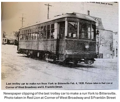 One of the trolleys going to Bittersville on this line was called “the Dallastown Flyer” because it “ was quite speedy”. When the line was abandoned, the track from Bittersville toward Windsor was the first portion to be removed by workmen and “gang crew”. After trolleys were discontinued, several people purchased the cars for summer cottages.